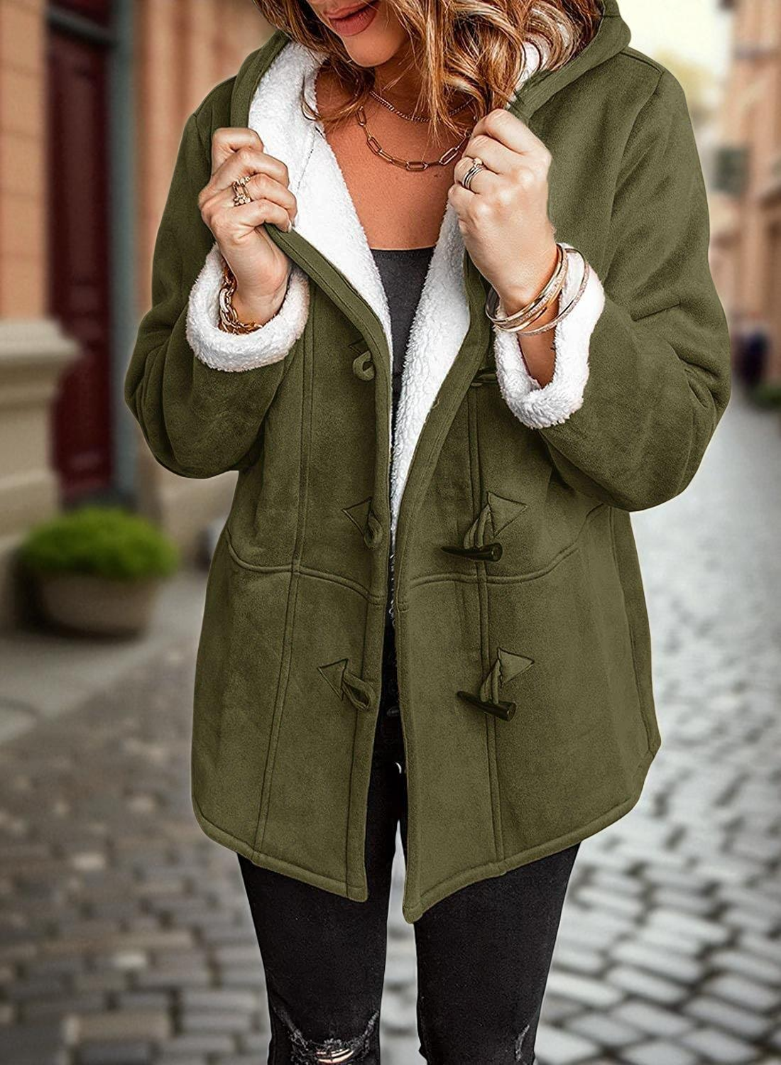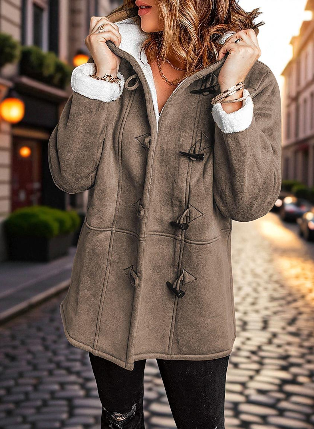 Model Amelia zachwyca połączeniem faktur. Zewnętrzna warstwa o strukturze miękkiego zamszu chroni przed wiatrem, podczas gdy wnętrze (w tym kaptur i mankiety) wyściełane jest puszystym, białym kożuszkiem typu "sherpa". Stylu dodają mu charakterystyczne zapięcia na kołki (toggle), które nawiązują do klasycznych budrysówek, ale w lżejszym, bardziej kobiecym wydaniu.